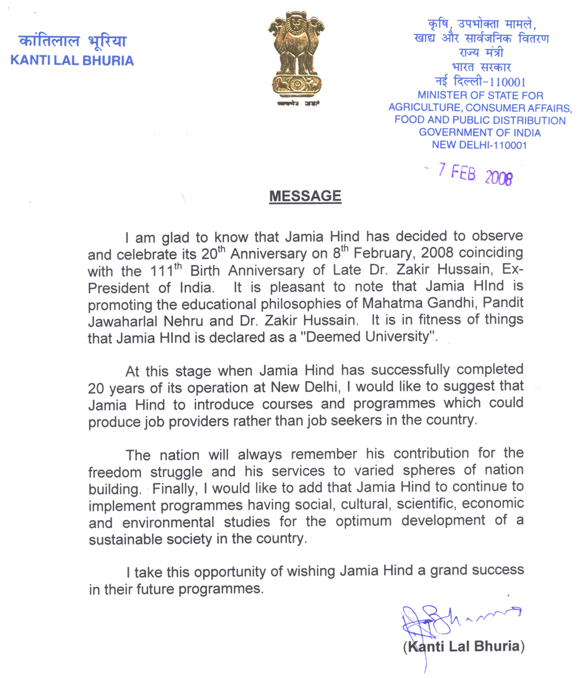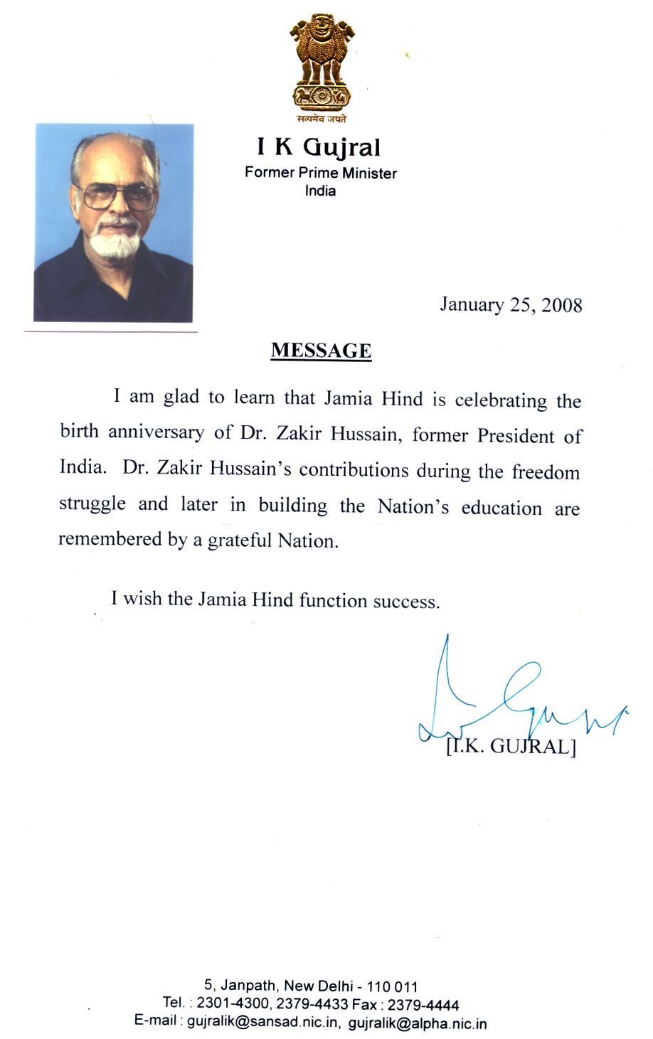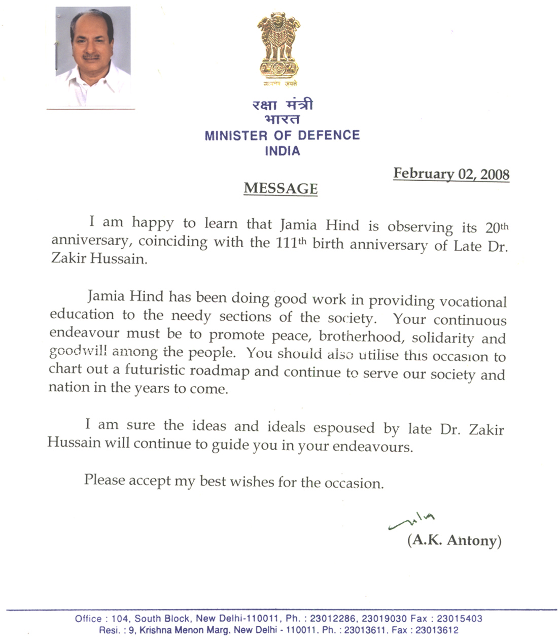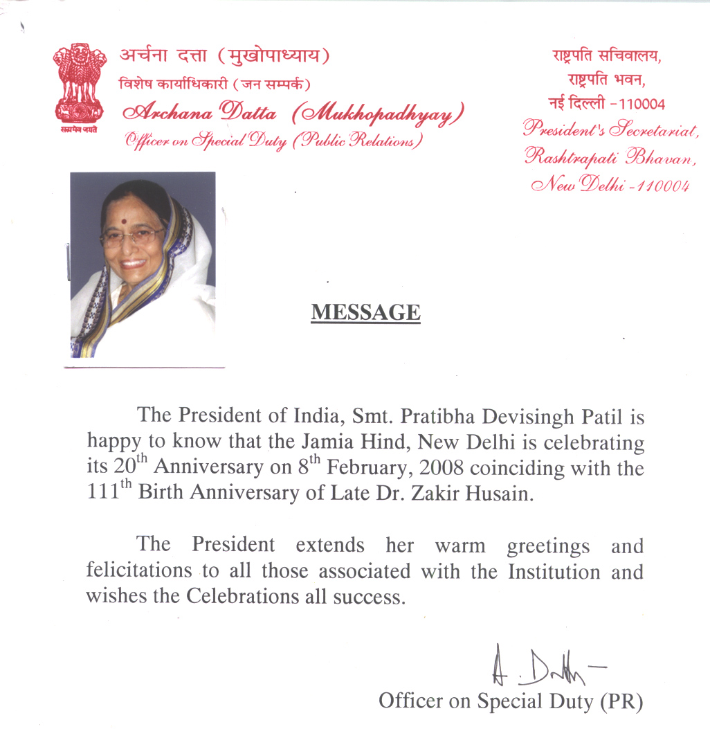 sent their good wishes on the occasion of Jamia Hind's 20th Anniversary. |